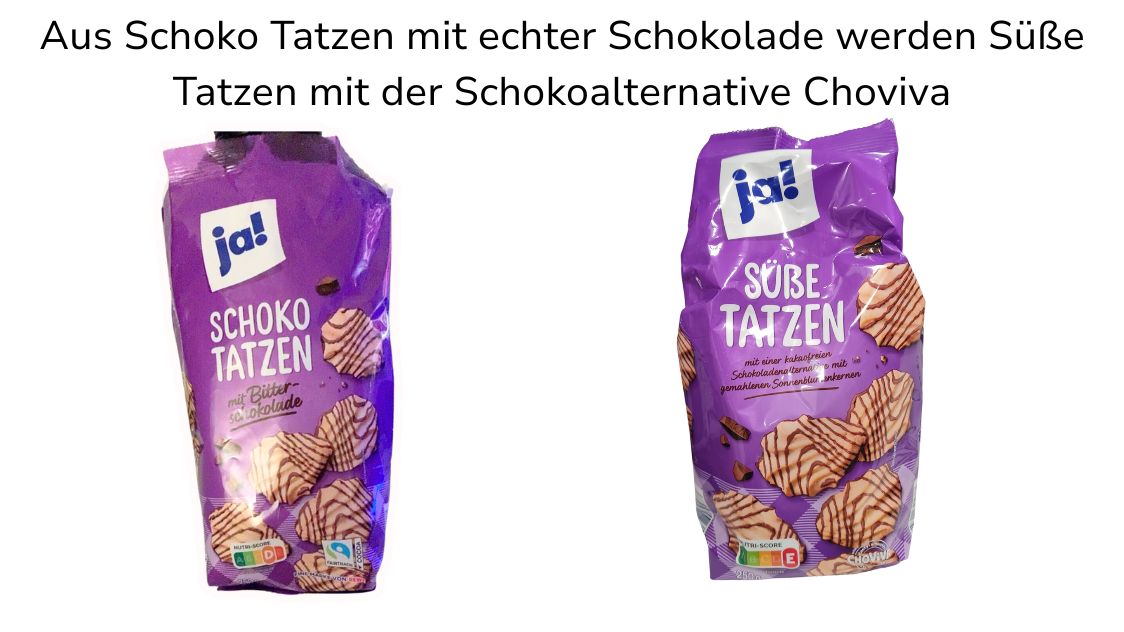 Schon im vergangenen Jahr haben wir nach dem starken Anstieg der Rohkakaopreise Süßwaren gefunden, bei denen echter Schokoladenüberzug durch eine kakaohaltige Fettglasur ersetzt wurde. Dabei kommen statt Kakaobutter andere pflanzliche Fette wie Palmfett, Sheafett oder Illipebutter zum Einsatz. Das Ergebnis sind Schokoladen-Imitate. Hersteller sparen auf diese Weise an wertvollen Zutaten, ohne dass Verbraucherinnen und Verbraucher dies auf den ersten Blick unbedingt erkennen (→ Skimpflation). Wichtig ist die Unterscheidung: Choviva ist eine kakaofreie Alternative auf Basis von Sonnenblumenkernen.
