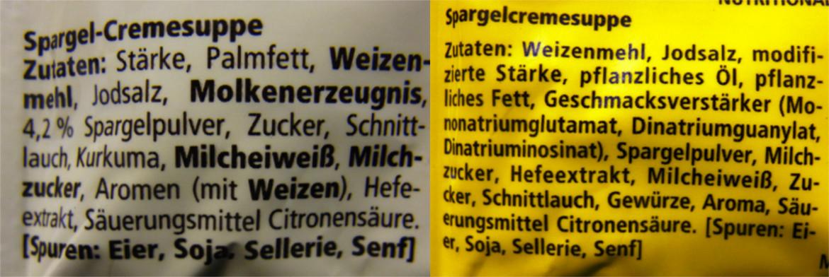 Auf der anderen Seite hat Nestlé die Rezeptur verbessert: Der Geschmacksverstärker Mononatriumglutamat (E 621) und weitere geschmacksverstärkende E-Nummern wurden verbannt. Das ist sehr erfreulich. Laut Stellungnahme von Nestlé ist zusätzlich noch der Spargelpulveranteil „um das dreifache erhöht“ worden. Nachprüfen können wir die Aussage nicht, da auf der alten Packung eine Mengenangabe zum Spargelpulver fehlt. Er liegt jetzt bei 4,2 %, das sind dann umgerechnet rund 0,8 g Spargelpulver (!) pro Teller Suppe. Man möchte gar nicht darüber nachdenken, wie wenig Spargel vorher drin war. Die fehlenden Geschmacksverstärker ziehen aus unserer Sicht Änderungen bei den Nährwerten nach sich: Der Fett- und Zuckergehalt - beides gute Geschmacksträger – erhöhen sich laut Nährwerttabelle in etwa auf das Doppelte, und auf Aromen wird auch in der neuen Variante nicht verzichtet.