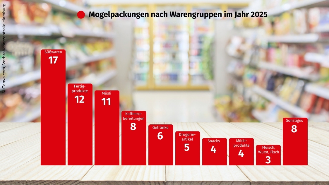 Wir suchen die »Mogelpackung des Jahres 2025«. Fünf besonders dreiste Fälle von Shrinkflation stehen zur Wahl. Bis zum 20. Januar 2026, 16 Uhr können Sie online abstimmen. Machen Sie mit!