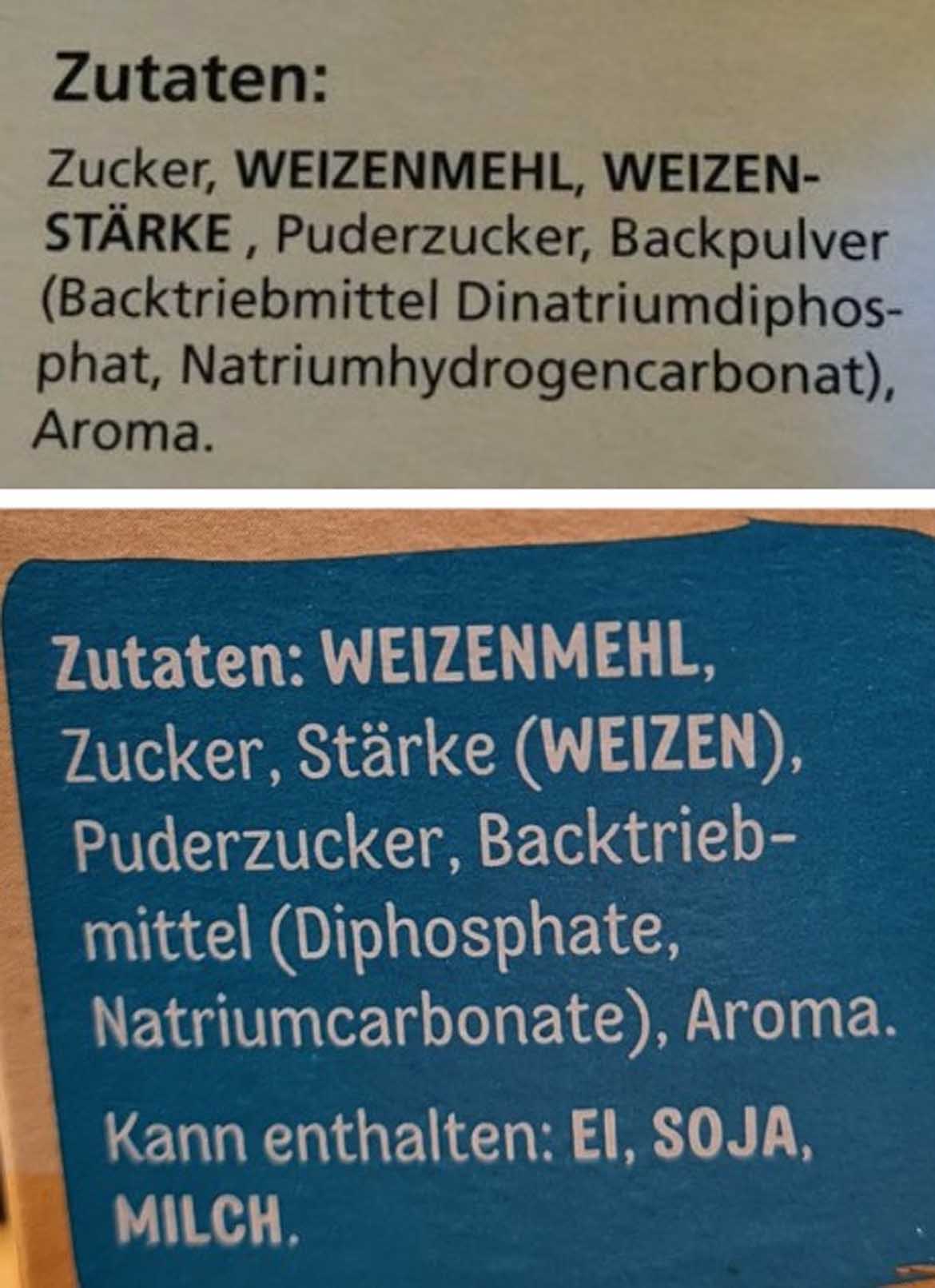 - Die Zutaten der beiden vermeintlich unterschiedlichen Backmischungen selbst sind exakt gleich. Es ist eine aromatisierte Mehl-Zucker-Mischung mit Backtriebmittel, die nunmehr zum stolzen Preis von über 10 Euro pro Kilogramm verkauft wird.