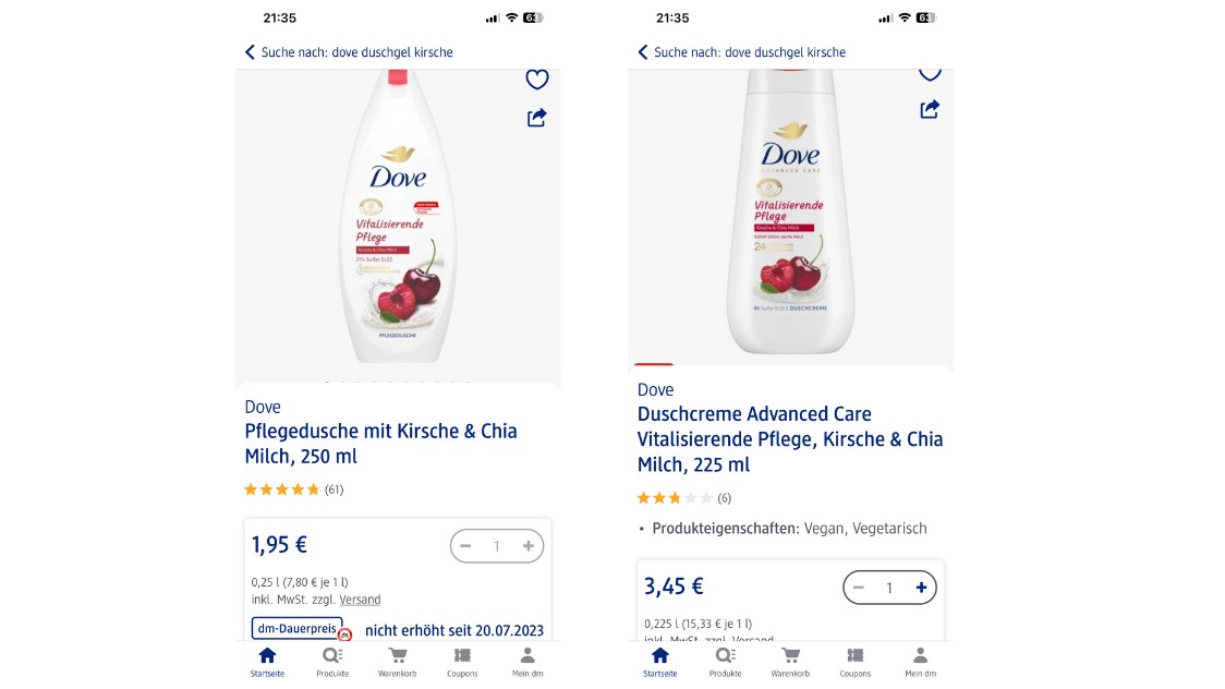 Die neue Dove Advanced Care von Unilever enthält nur noch 225 Milliliter Duschcreme pro Flasche; beim Vorgängerprodukt Dove Pflegedusche waren es noch 250 Milliliter. Gleichzeitig ist das neue Produkt deutlich teurer: Bei dm kostet es 3,45 Euro (statt 1,95 Euro) und bei Rossmann je nach Filiale genauso viel oder 3,49 Euro (statt 1,99 Euro).