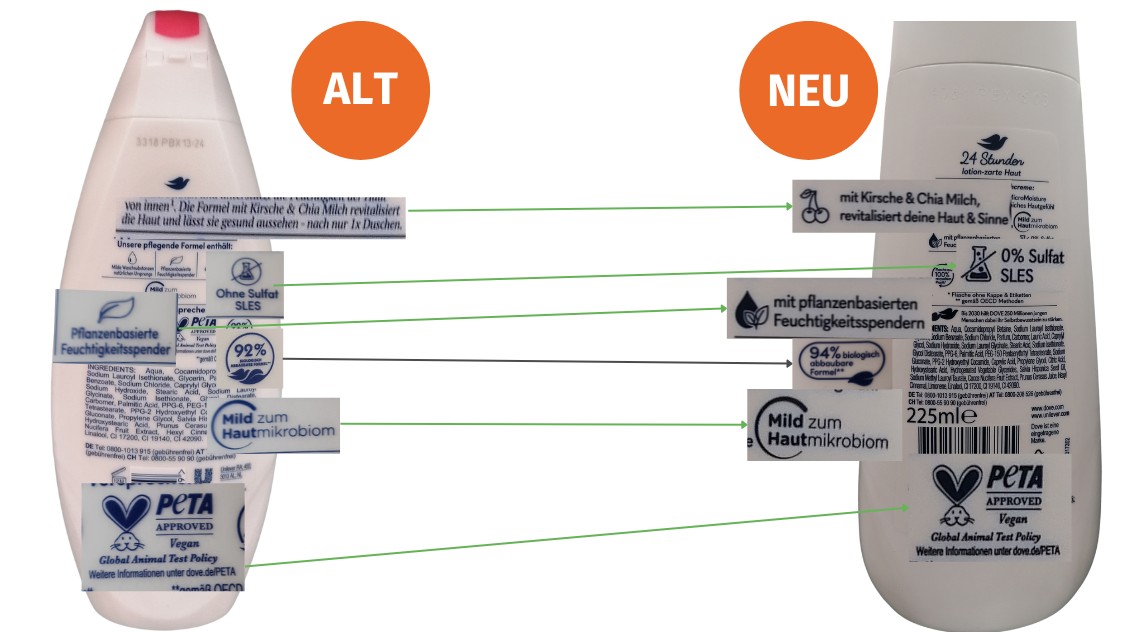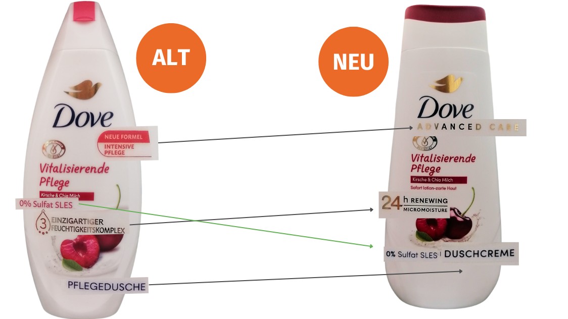 In letzter Zeit argumentieren die Hersteller uns gegenüber gerne damit, dass es sich bei einem Produkt nicht um ein Nachfolgemodell, sondern um ein ganz anderes, viel besseres Produkt handele – so wie im Falle von Dove. Um dies zu unterstreichen, erhält das neue Produkt eine neue EAN-Nummer. Doch die vermeintlichen Innovationen behalten natürlich ihren Stammplatz im Verkaufsregal, sodass Kundinnen und Kunden wie selbstverständlich zugreifen, ohne die Shrinkflation zu bemerken. Dove will sich mit diesem Relaunch – mehr ist es aus unserer Sicht nicht – im höherpreisigen „Premium-Segment“ etablieren.