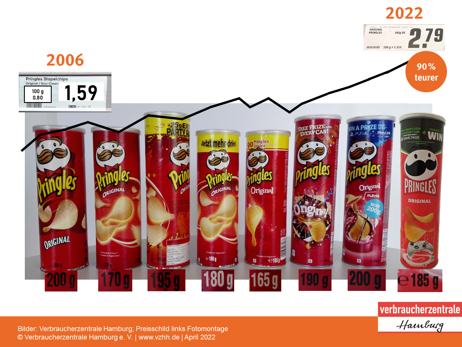 - Mindestens fünfmal haben die Hersteller der Pringles Chips Verbraucherinnen und Verbraucher bislang mit Füllmengenänderungen hinters Licht geführt. Seit 2006 sind die Chips mit diesem Trick um 90 Prozent teurer geworden.