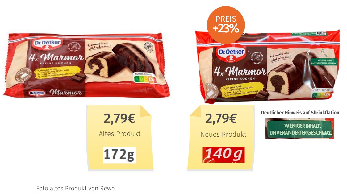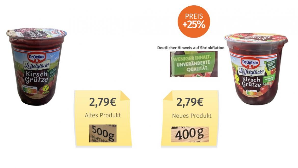 Positiv fällt auf: Dr. Oetker weist auf die Reduzierung der Füllmengen mit einem grünen Störer direkt auf der Vorderseite der Verpackungen hin, zum Beispiel „Weniger Inhalt. Unveränderte Qualität“. Das ist transparenter als bei den meisten anderen Herstellern. Zusätzlich gibt es QR-Codes, die auf Websites mit Erklärungen verweisen. Aus Verbrauchersicht ist dies ein Schritt in die richtige Richtung.
