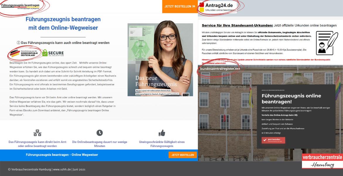 „Die Seite fuehrungszeugnis-online-beantragen.de suggeriert, dass man direkt bei ihnen das Führungszeugnis online beantragen kann (durch entsprechenden Namen der Website, wie auch den Button - hier direkt...). Man erwirbt für 13 Euro aber tatsächlich nur eine Schritt-für-Schritt-Erklärung, wie man das Führungszeugnis online auf der Website des Bundesamts für Justiz (BfJ) beantragen/bestellen kann.“